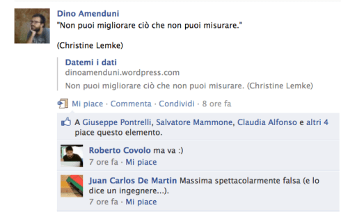 Rileggere la definizione del vocabolario, devo dirvi la verità, mi ha riconciliato con la lingua e con il buon senso. E anche con il buon umore. Mi è sembrato automatico il collegamento con uno scambio (im)mediato di questa mattina. Sono partito da una valutazione che mi sembrava oggettiva (dati che parlano di dati, oggettività che parla di oggettività), poi Juan Carlos ha rovesciato il tavolo. Secondo me ha ragione lui e ha ragione pure Christine Lemke. Con i dati si fanno valutazioni lucide ed è più facile capire se la direzione di marcia è giusta; senza dati si può comunque tendere al miglioramento.